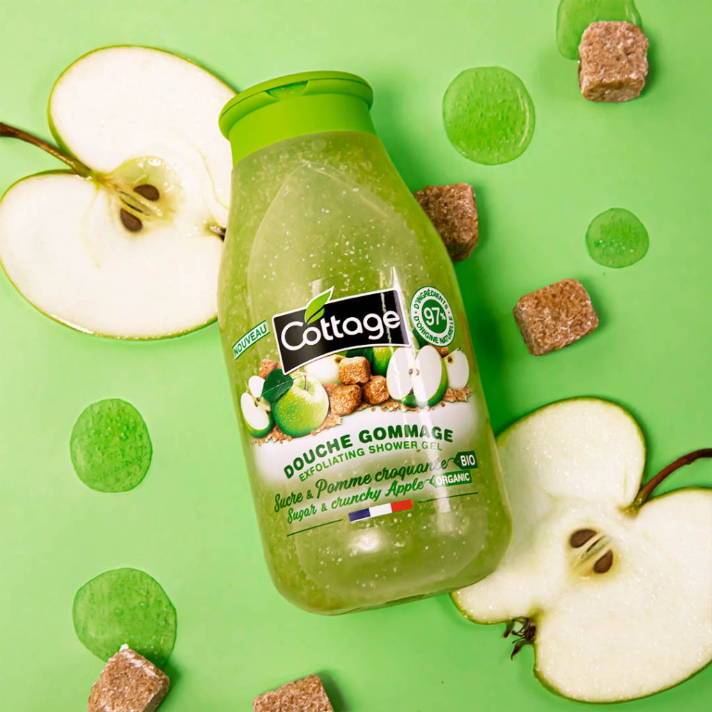 A true daily beauty ritual, Cottage Exfoliating Shower Gel gently exfoliates your skin thanks to its formula made with 97% ingredients of natural origin* enriched with natural extracts of sugar and ORGANIC apple**. Freed from dead skin cells, your skin regains its original softness and remains delicately scented.